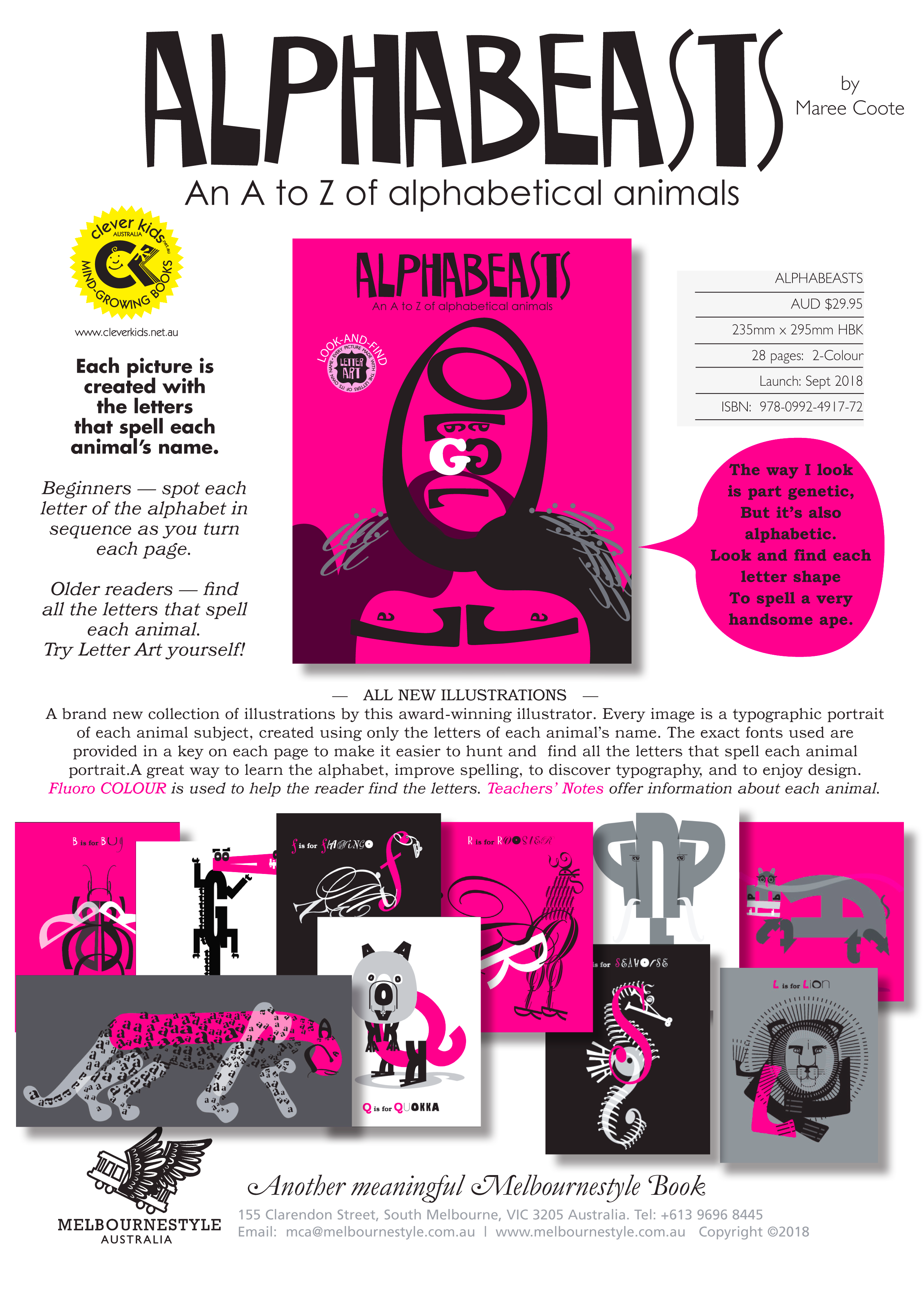 ALPHABEASTS Written and Illustrated by Maree Coote CAN YOU SPELL GORILLA? YES? WELL...CAN YOU SPELL A GORILLA? The latest in an award-winning series of typographic illustrations. Much more than an average 'abecedary', this alphabet book is created with illustrations made entirely of the letters! --- the letters that spell the subject's name. As the reader progresses through the alphabet-- from A to Z, one illustration per page-- they can also linger on each page to hunt and find all the letters that go to construct every picture-- and spell every animal. (AUS SEPT 2018 USA TBC ) Includes: -Teachers notes RRP $29.95 ISBN 9780-9924917-72 ABOUT THE AUTHOR/ILLUSTRATOR Reviews |