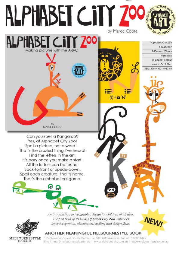 Alphabet City Zoo, a brand new puzzle book by Maree Coote. In this new series of books, Maree has invented a brand new typographic puzzle-picture FONTIGRAM. This is a world first and a new development on Visual Poetry (also known as Concrete Poetry). The result is both fun and educational, as spelling becomes a letter hunt. Offering a whole new way of looking at spelling, this visual language has great potential benefit to 'creative' learners, many of whom succeed better at learning via creative tangents. Designed to improve letter recognition, observation, spelling and design skills. SEE ALSO: LETTERS FROM MELBOURNE
