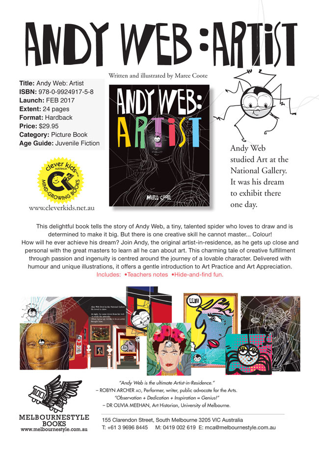 Andy Web: Artist is a brand new children's picture book by Maree Coote. This delightful book tells the story of Andy Web, a tiny, talented spider who lives in the National Gallery and loves to draw. Andy is determined to make it big, but there is one creative skill he cannot master: Colour! How will he ever achieve his dream? Join Andy, the original 'artist-in-residence', as he gets up close and personal with the great art masterpieces to learn all he can about art. An original tale of creative fulfillment through passion and study, centred around the journey of a lovable character. Delivered with unique illustrations, it offers a gentle introduction to Art Practice, Art History and Art Appreciation. Includes: -Teachers notes -Glossary -Hide-and-find fun. RRP $29.95 ISBN 9780-9924917-5-8 About the author REVIEWED BY KIDS BOOK REVIEW ![]() "This is a brilliant story designed to bring children closer to art..." READ FULL REVIEW HERE More reviews