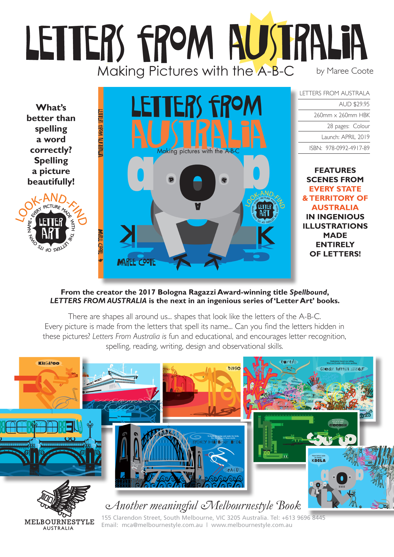 LETTERS FROM AUSTRALIA by Maree Coote COMING SOON! | ![]() Every picture in this book is made with letters if you look! Look inside and you will find, Letter shapes of every kind! KIDS BOOK REVIEW, APRIL 2019: "Full of artistry and ingenuity, this is highly recommended for homes and classrooms" READ FULL REVIEW HERE: ![]() "This is an eccentric, stimulating, appealing addition to the body of work by the imaginative, creative author of Alphabeasts and Robyn Boid: Architect. Delightfully inventive and highly recommended." --Russ Merrin, Magpies Vol 34, May 2019. READ FULL REVIEW HERE: