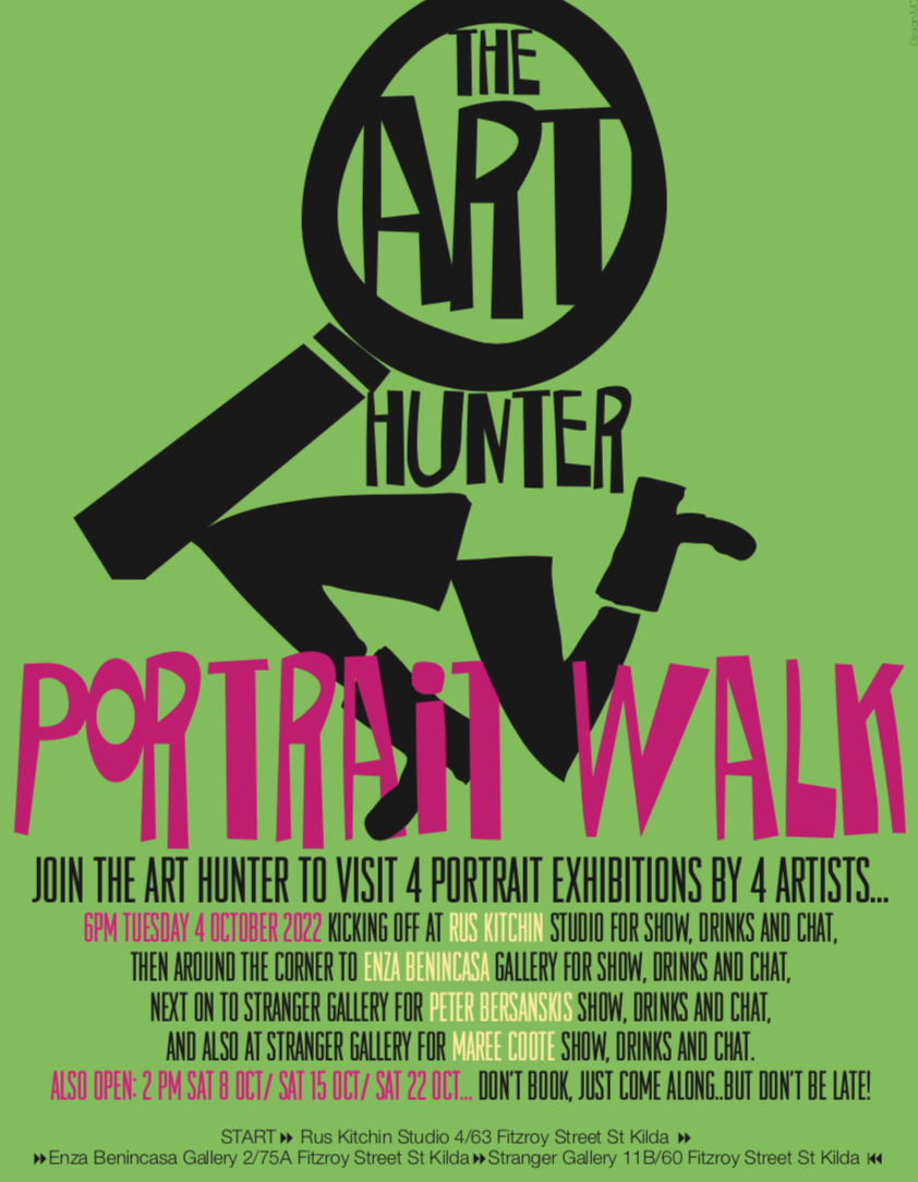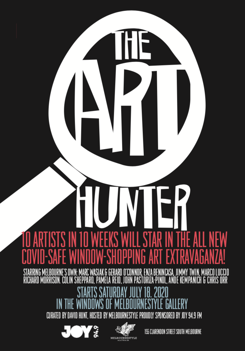 ![]() ![]() | Created my Maree Coote during COVID as a way to bring hope and purpose to COVID-isolated artists, and also to bring Art to passers-by during their lockdown walks by enlivening Melbournestyle Gallery's windows with a rolling and ever-changing exhibition. Featuring one artist per week over ten weeks The Art Hunter is a showcase of art and creativity. ![]() | ![]() ![]() |