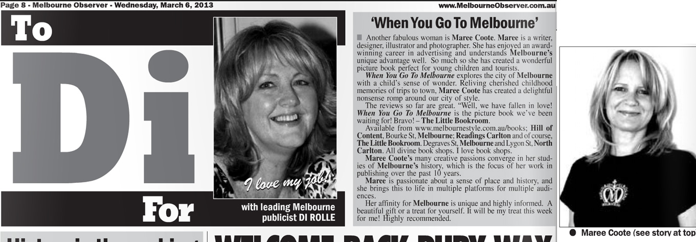 MAR, 2013: Melbourne Observer reviews Melbournestyle Books' new title: WHEN YOU GO TO MELBOURNE. Big thanks to the marvellous Di Rolle for her interest and support.