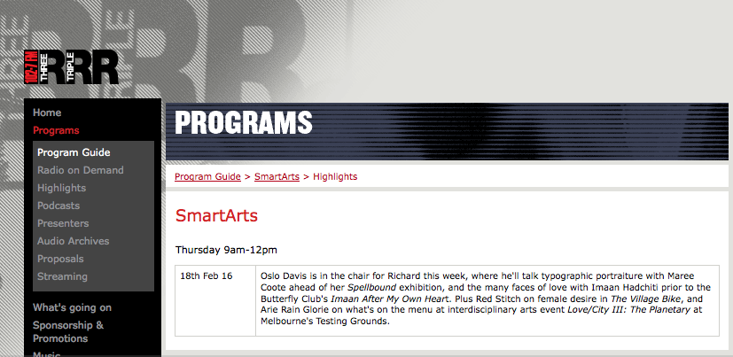 February 16,2016: RRR SMART ARTS Oslo Davis is in the chair for Richard this week, where he'll talk typographic portraiture with Maree Coote ahead of her Spellbound exhibition.......MORE