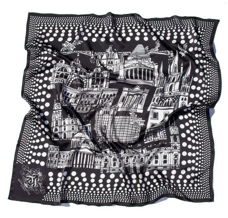 | melbourne buildings/BLACK Sketches of Melbourne's iconic architecture are edged with a border of concentric dots designed for maximum graphic effect when tied. 100% SILK 97x97cm Buy Now |