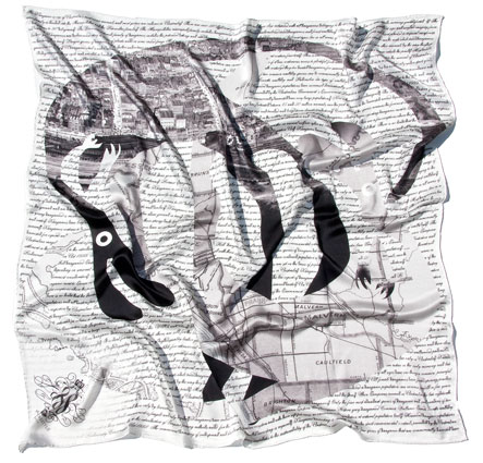 | roo map Kangaroo motif rendered in a collage of 19th & 20th century Melbourne street and botanical maps and underlaid with script text recounting data on the life cycle, biology, habits and habitat of the kangaroo. 100% SILK 97x97cm. CLICK on scarf to enlarge. Buy Now |