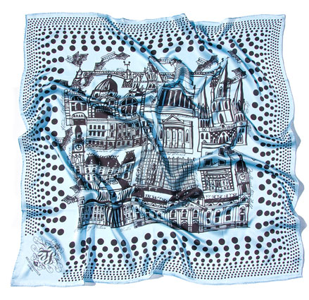 | melbourne buildings /BLUE This time in duck-egg blue and black, features drawings of Melbourne's landmark architecture adorned with flying trams. Perfect for summer days or to lift the classic Melburnian black silhouette. 100% SILK 97x97cm Buy Now |