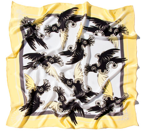 | yellow galahs Sulphur-crested cockatoos and flowering eucalypt blossoms form a pattern rendered in subtle shades of yellow accented with grey and black. 100% SILK 97x97cm Buy Now |